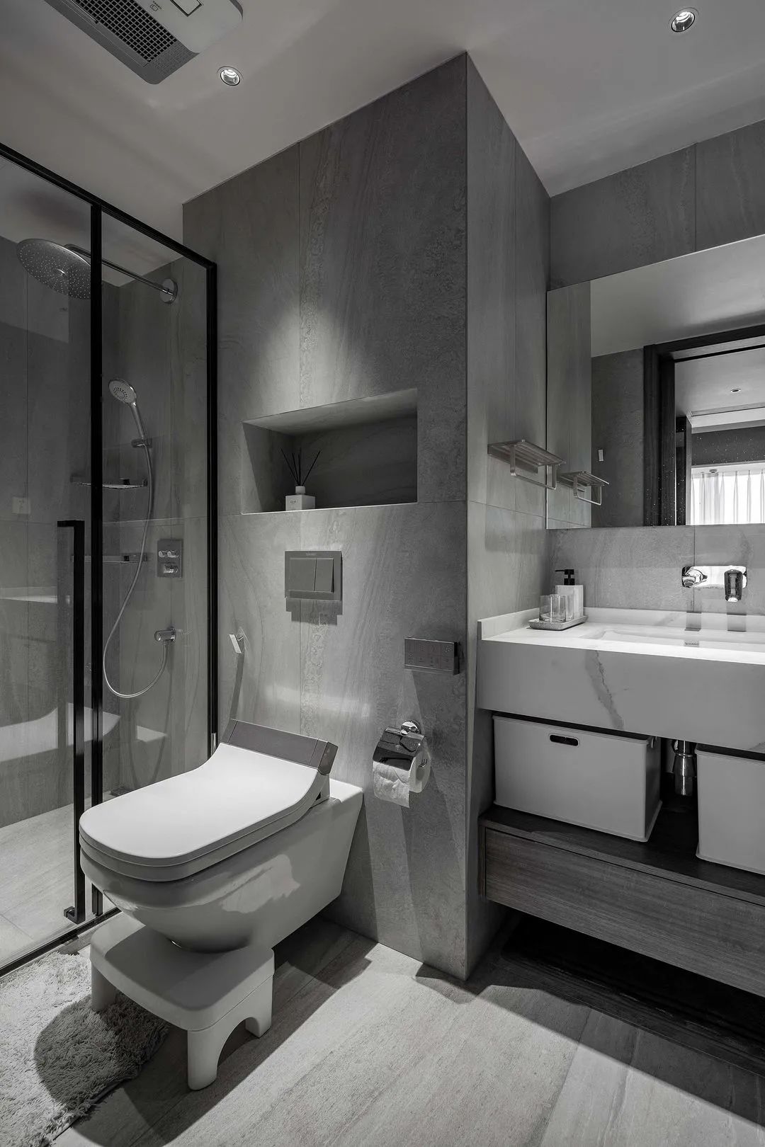 衛生間墻地統一了灰調,在壁掛馬桶的背后留出了壁龕,放置香氛,讓沐浴更衣這件事充滿了儀式感