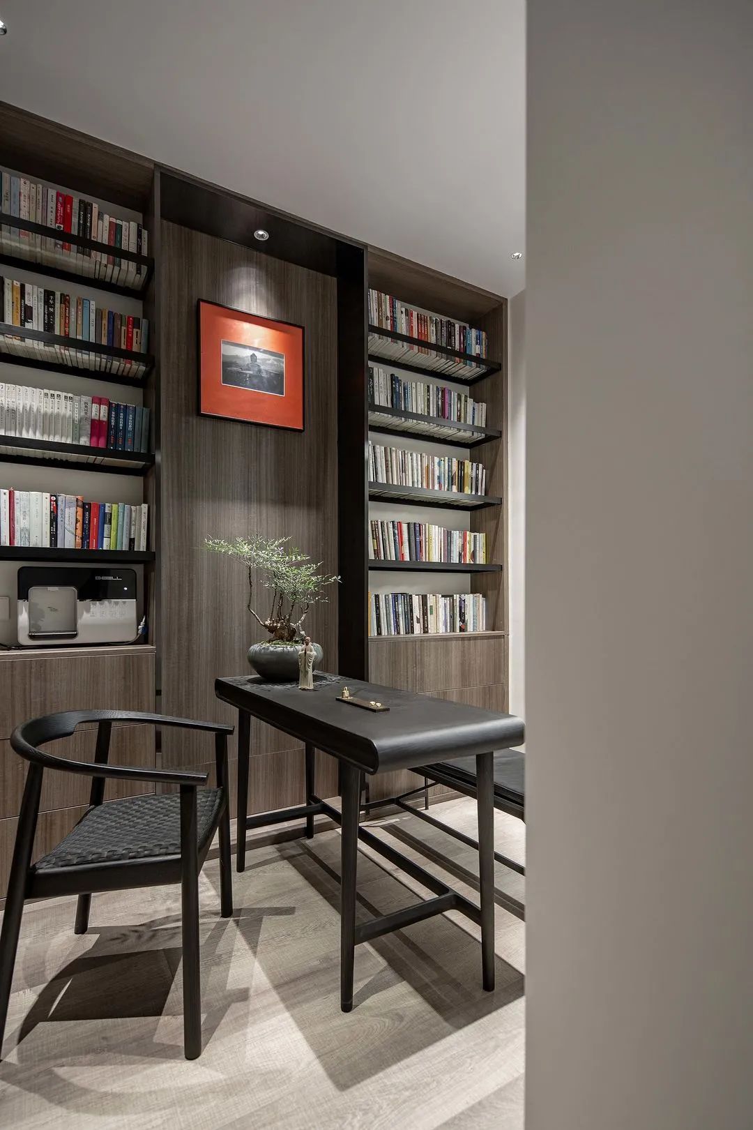 公共空間的墻體都做了飾面裝飾,但沒有過多的線條造型;家具表達的設計語言也是沉穩的;即使是B&O的音響,只選用了簡潔的單色