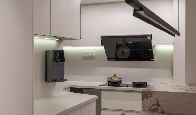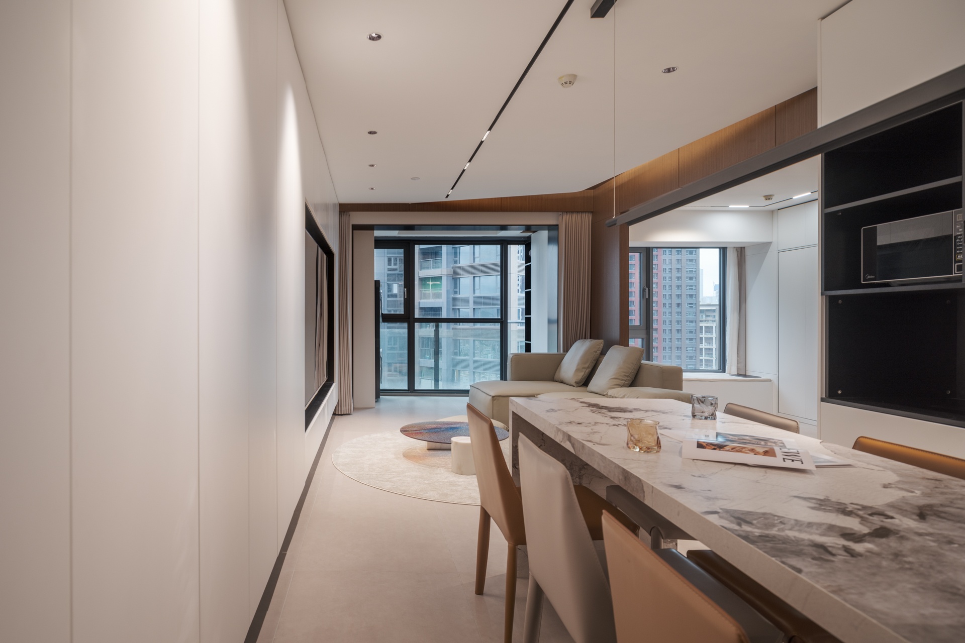 視覺統一異形切割吊頂設計,是契合空間而存在的,借由設計創意轉化成獨具個性的藝術領悟。巖板材質的拼接為空間增加了跳躍的氛圍,定制飾面板柜體收納更集中。
