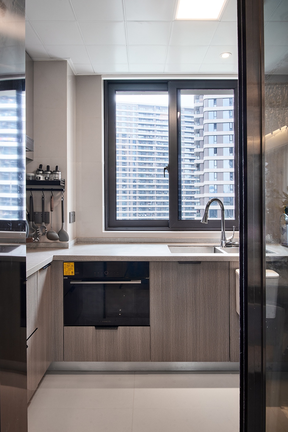 廚房與餐廳之間以玻璃推拉門為隔斷,半開放式設(shè)計(jì),讓烹飪空間更為自由。U型廚房,各操作區(qū)得到明顯區(qū)分,洗、切、抄、起、盛的動(dòng)作一氣呵成。