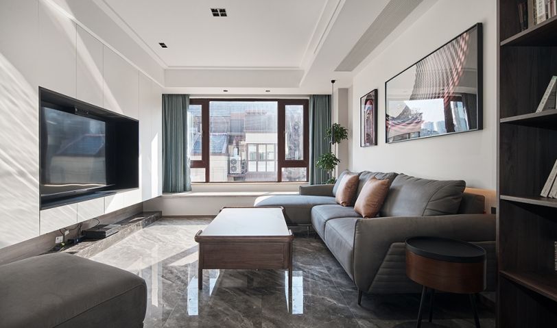客廳采用無主燈設計,使視野更加開闊。電視墻則為整體設計的定制收納柜,雖然犧牲了客廳的一部分面積,但卻極大的增強了家庭的收納空間。