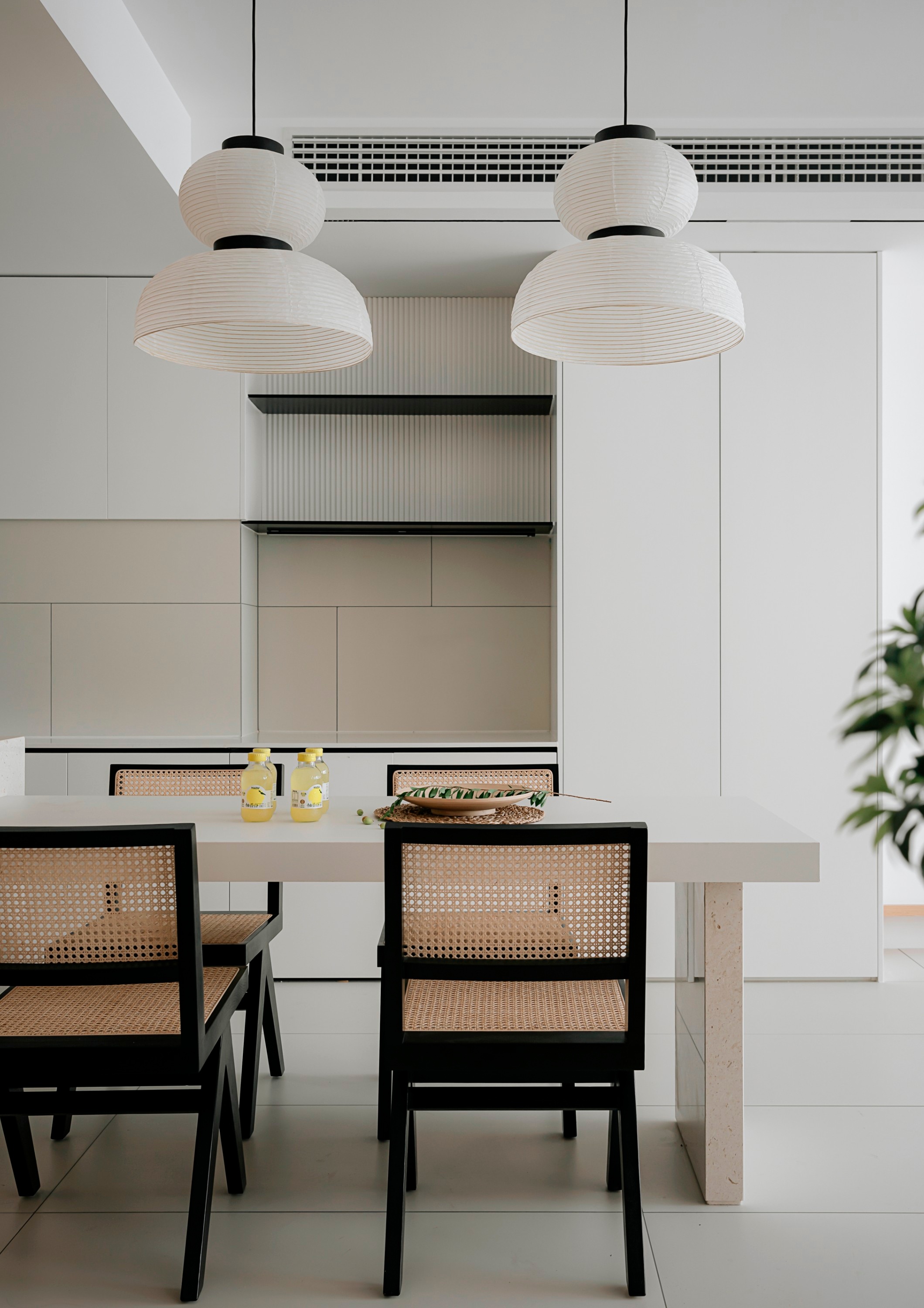 櫥柜和餐邊柜均以白色系為主,保留儲物空間同時,盡可能削弱柜體的厚重感,降低視覺壓迫。