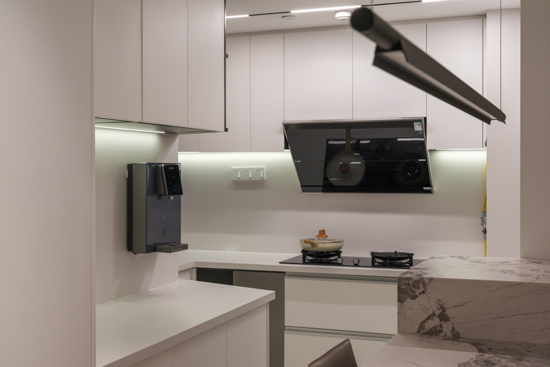 櫥柜點位預留嵌入式燈帶,壁掛式的管線飲水機,將家電與定制做到了一體化,餐邊柜等鏤空區域也可以輔助廚房作為操作臺使用,拋開傳統的擋水條巖板墻面一體美縫收邊,廚房免去了一切電線外露的困擾,將極簡進行到底 #廚房#巖板#管線飲水機#操作臺