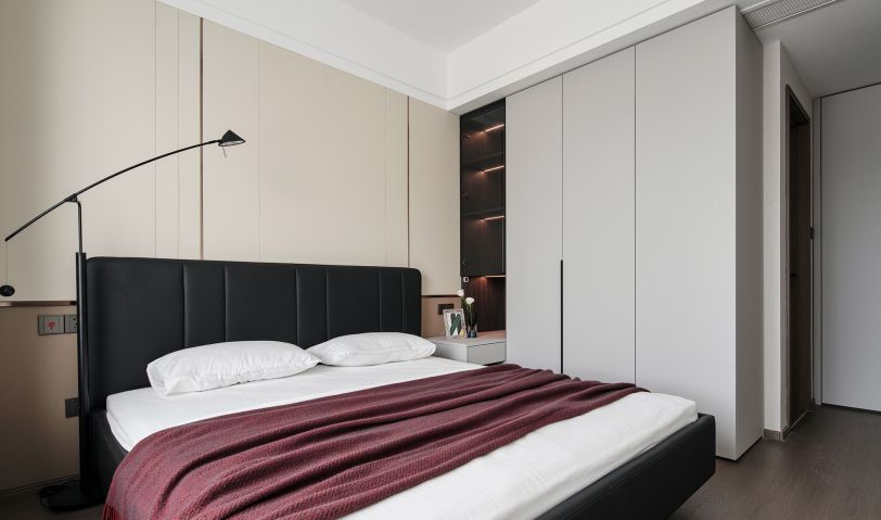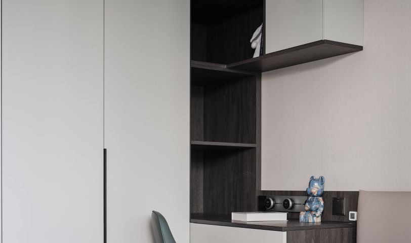 選用暗色調(diào)加強(qiáng)空間的簡(jiǎn)雅質(zhì)感,借細(xì)膩木紋為睡眠環(huán)境嫁接親密性,串聯(lián)富有情調(diào)的布藝,隨著豎向線條的分割、轉(zhuǎn)折、排列,流露出沉靜的氣氛。定制通頂柜體保持統(tǒng)一美感,布置層架細(xì)節(jié),表達(dá)收納和展示的趣致。