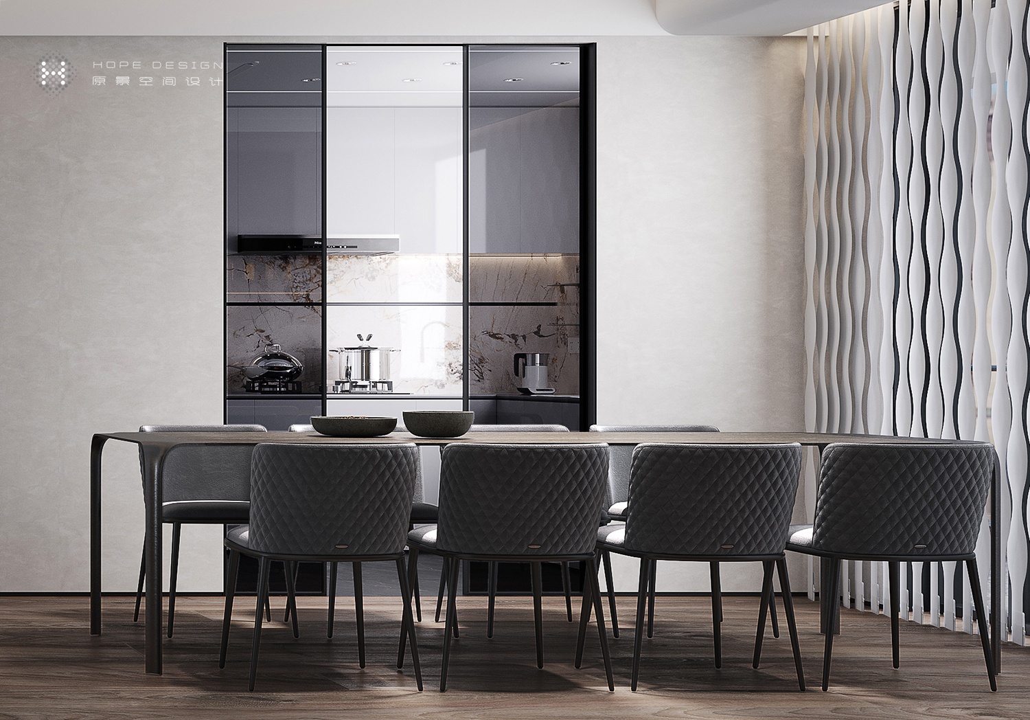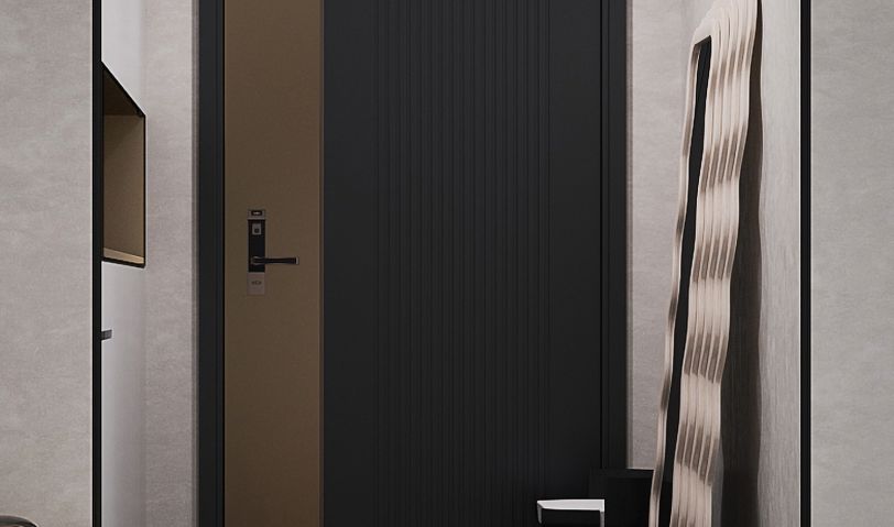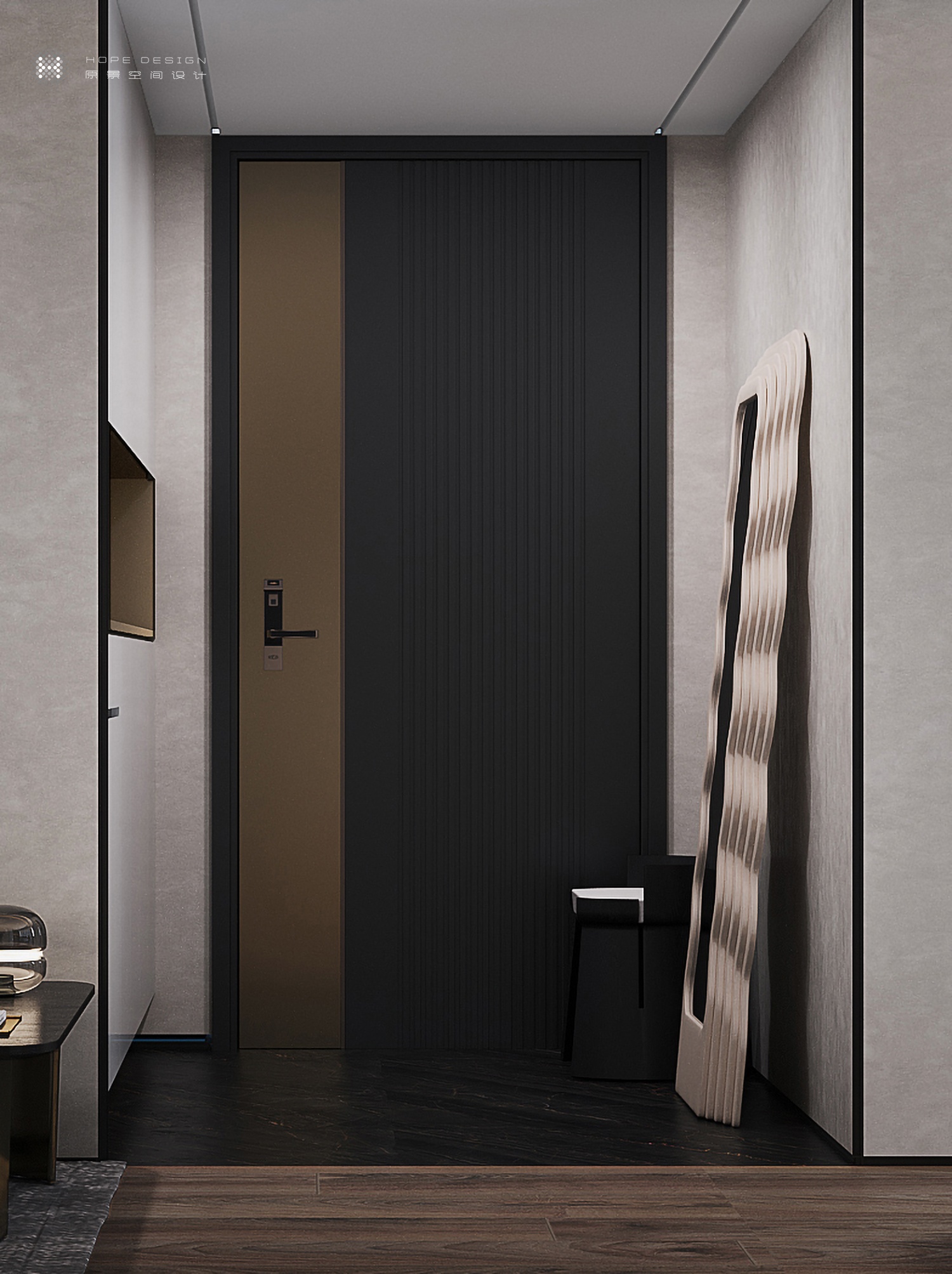推門而進,踏入”山林影徑“,玄關直入,魅影深灰色調向盡頭無限衍生。