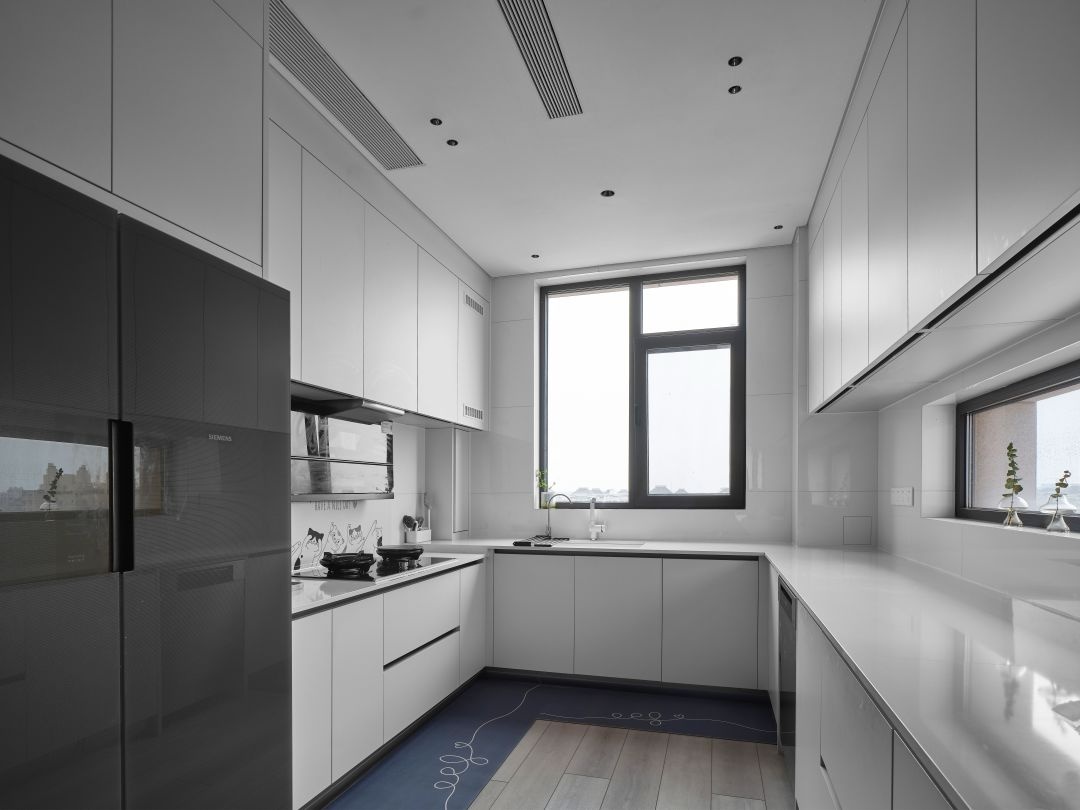 廚房利用窄邊黑框玻璃門地引進走廊的光線,全白柜體增加廚房的通透性,廚房延續(xù)了客廳的白色柜體與黑色線條,簡單干凈,與整體風格統(tǒng)一。用純凈的玻璃移門保證了封閉式廚房的通透與明亮。