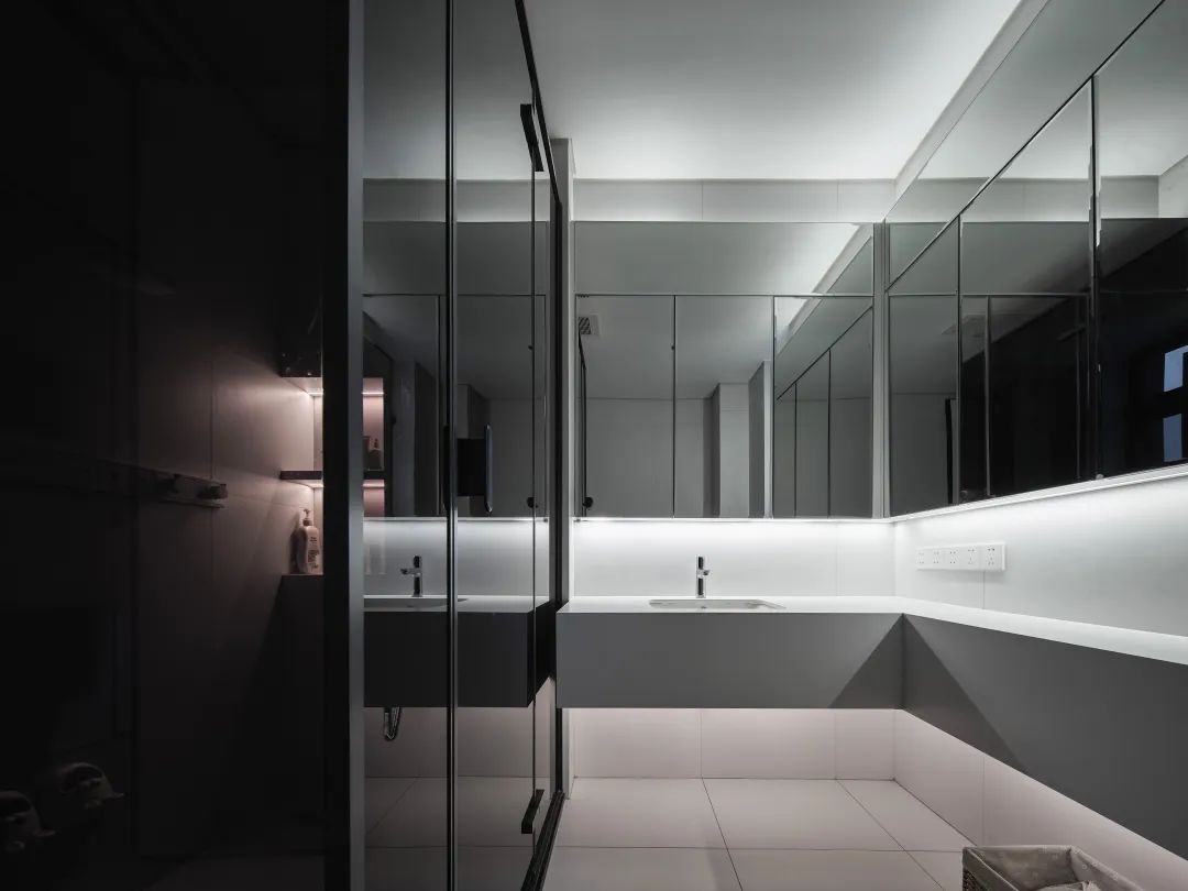 衛(wèi)生間是以通透純白色為基底,黑色的潔具與線條作點綴,黑色的浴室玻璃隔間給空間帶來了更多的神秘感。鏡面裝飾的懸浮浴室柜在保證空間極簡的氛圍下,給空間帶來了更多的延伸感。定制的懸浮洗手臺,在保證整體風格的統(tǒng)一下又便于清潔不易藏污。