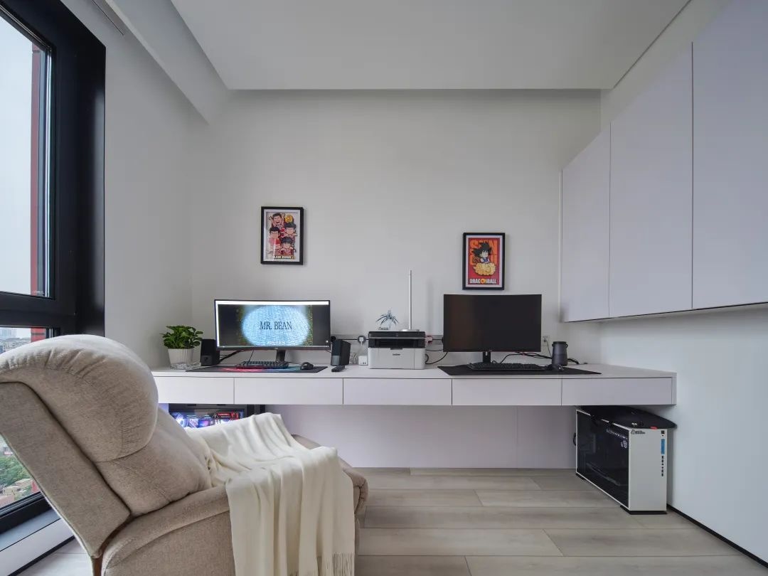 書房兼具娛樂功能,氛圍、色彩、材質(zhì)都保持了與整屋的統(tǒng)一性,視覺上延伸了空間感,在通透性和獨立性中做了很好的平衡。書房的書柜同樣采用了懸浮式的設(shè)計,滿足不同收納需求,白色的設(shè)定,更加突顯精致感與高級感。