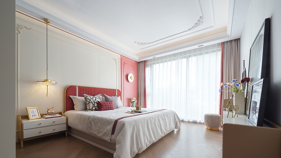 主臥延續了客廳的風格,灰白調搭配原木地板,點綴朱紅、粉色與金屬材質,營造優雅時尚感。天花及背景墻上華麗的簡歐式線條,與幾何造型的燈具搭配,散發出雅致舒適的休憩氛圍。