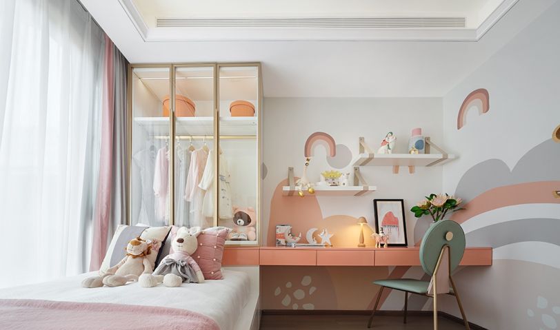 女兒房呈現出更為柔和的調性,淺粉色與淺藍色碰撞,幾何藝術在空間穿插,營造出恬靜柔美、充滿奇幻的溫馨氛圍。