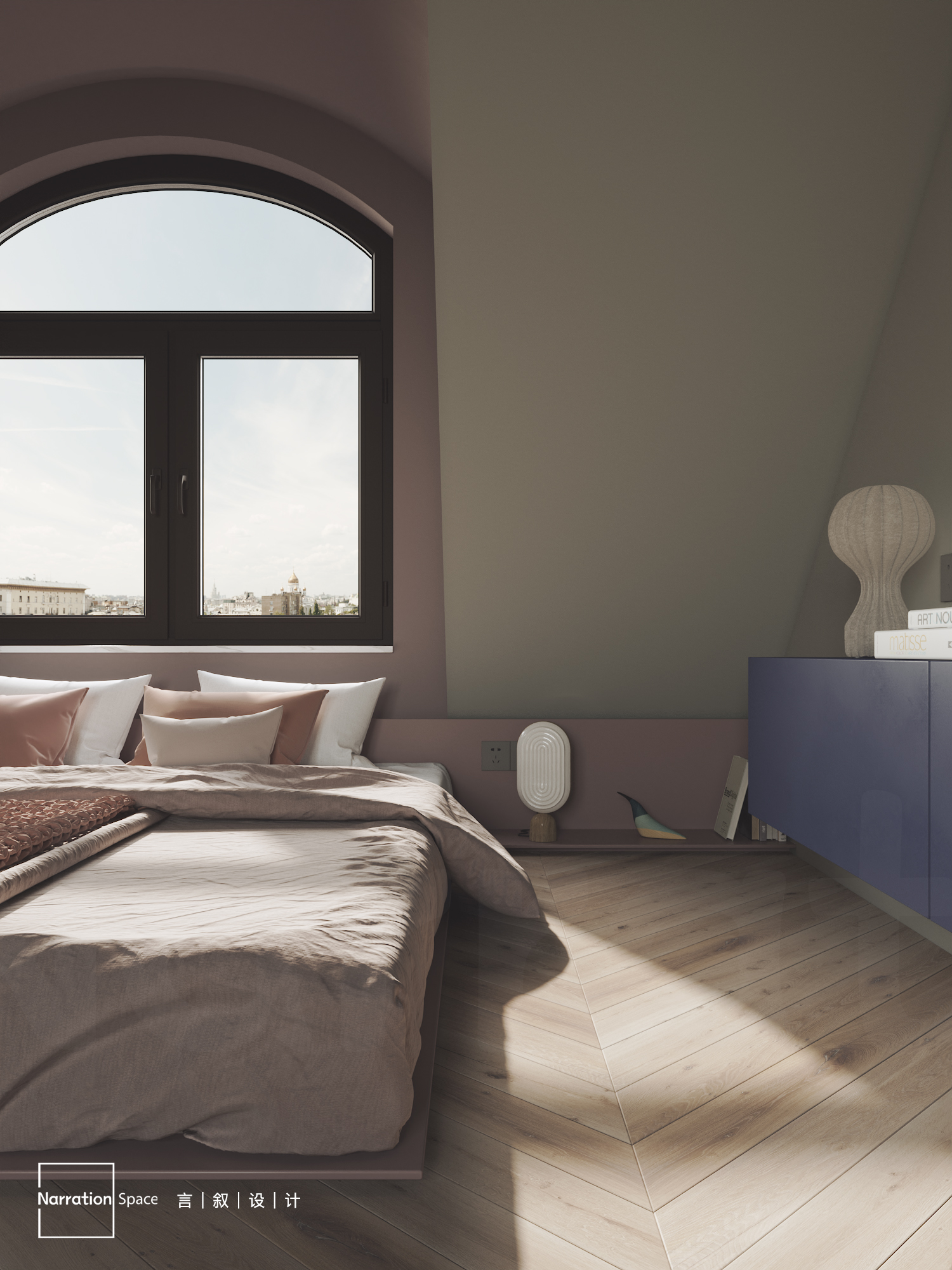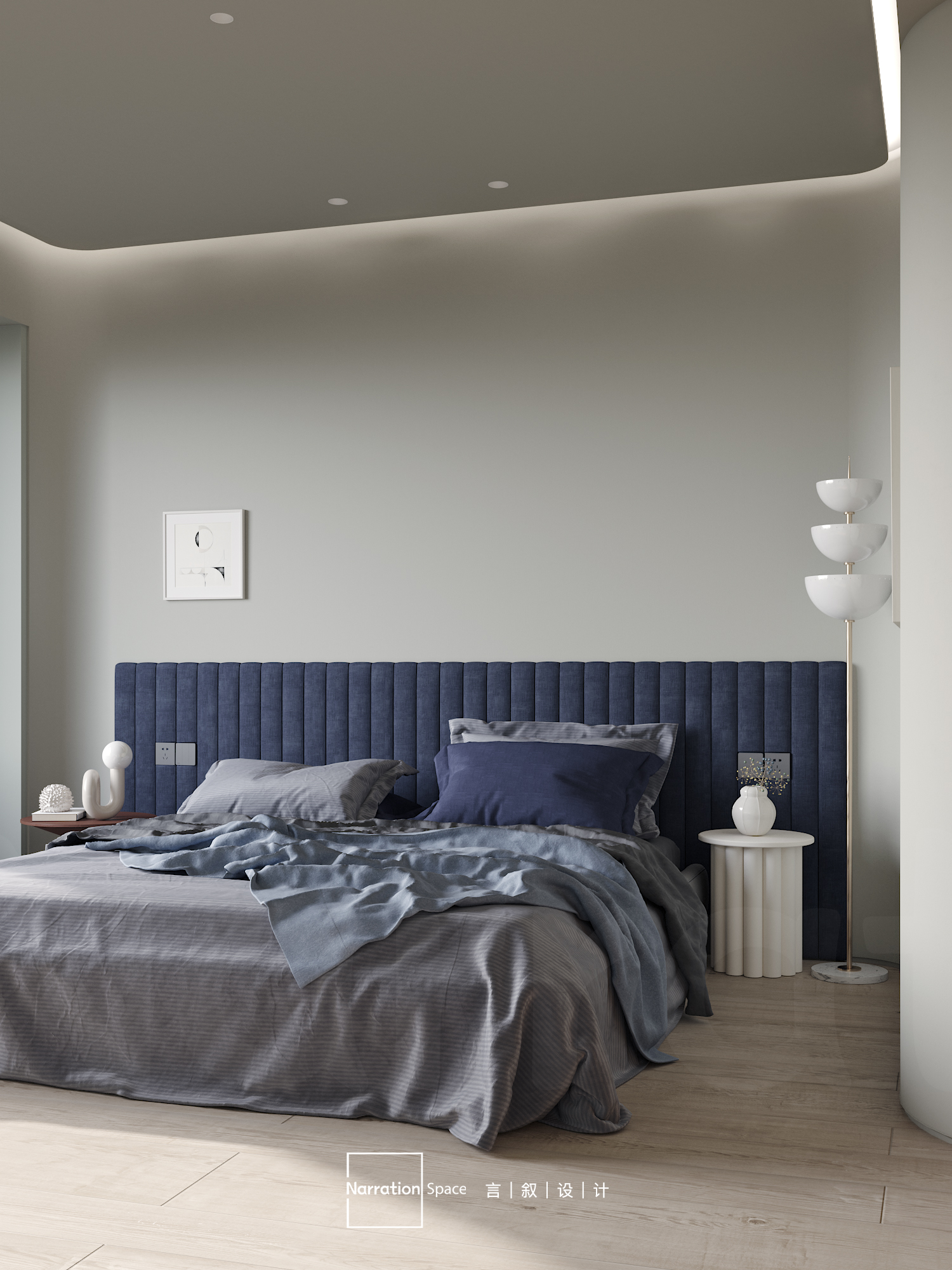 臥室。灰色和經典藍的結合讓空間變得神秘、靜謐;空間延續整體的弧形結構,產生直觀的細膩感受;頂部圓角矩形狀燈帶增添整體層次感,同時足以在夜間溫暖人的感官。