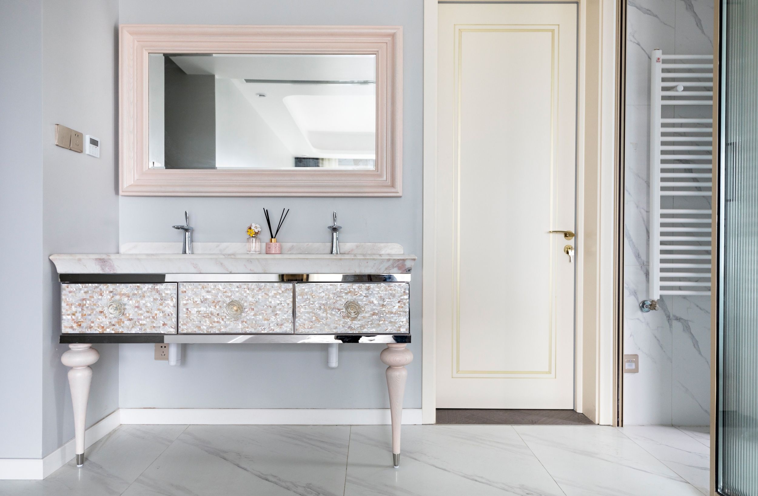 主臥衛(wèi)生間采用長虹玻璃,讓空間的通透性保證最大的情況下又保證的隱私。香檳金的窄邊框與整個空間干凈的配色又美又協(xié)調。