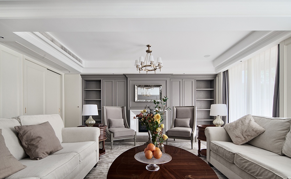 客廳以灰白為主色,簡單干凈,與深木色質的柜子在空間中交融而亮眼,多燈泡大燈在天花板上垂吊,賦予整個空間一種靜謐之美。