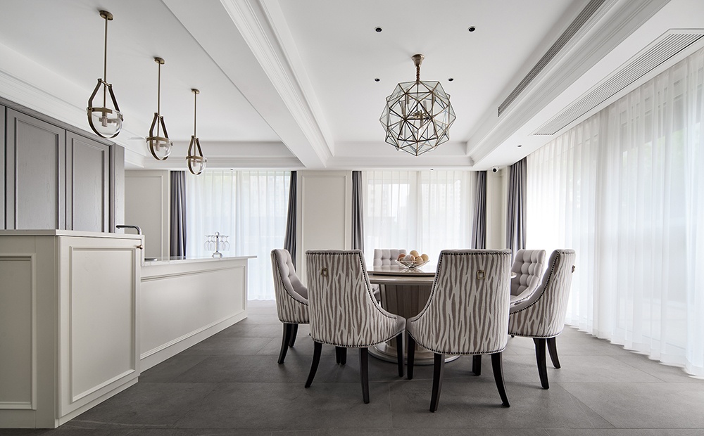 餐桌與背景墻間預留出的空間以西廚島臺進行填補,將餐廳的功能性提升至最大。內嵌的家用電器,更是將可用空間最大化。