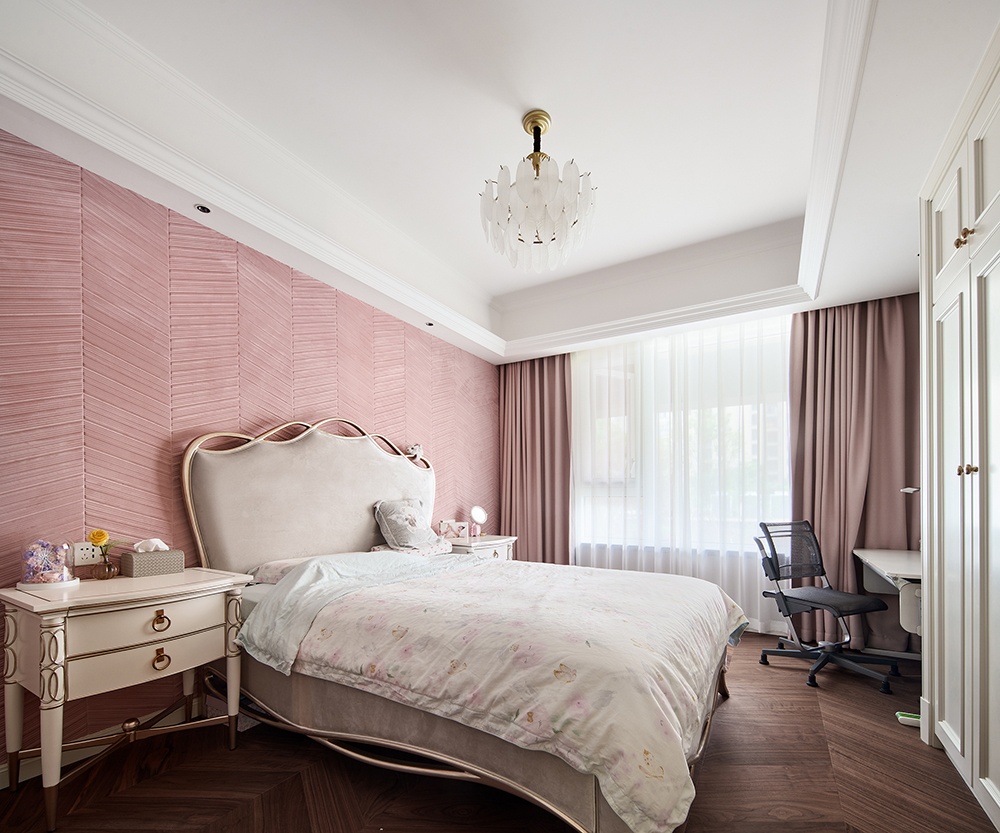女孩偏愛粉色,木質紋路的粉色墻壁與深色木地板相配,溫柔大氣。以金屬裝飾的床頭柜更是將法式風情拉滿。