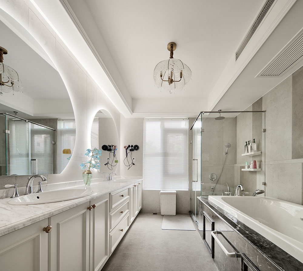 簡單、亮堂和實用是對衛生間最大的期望,直線型衛生間使空間一覽無遺,左右直曲線條的對望,動靜相合。多水池設計更是為時間管理做足了準備。
