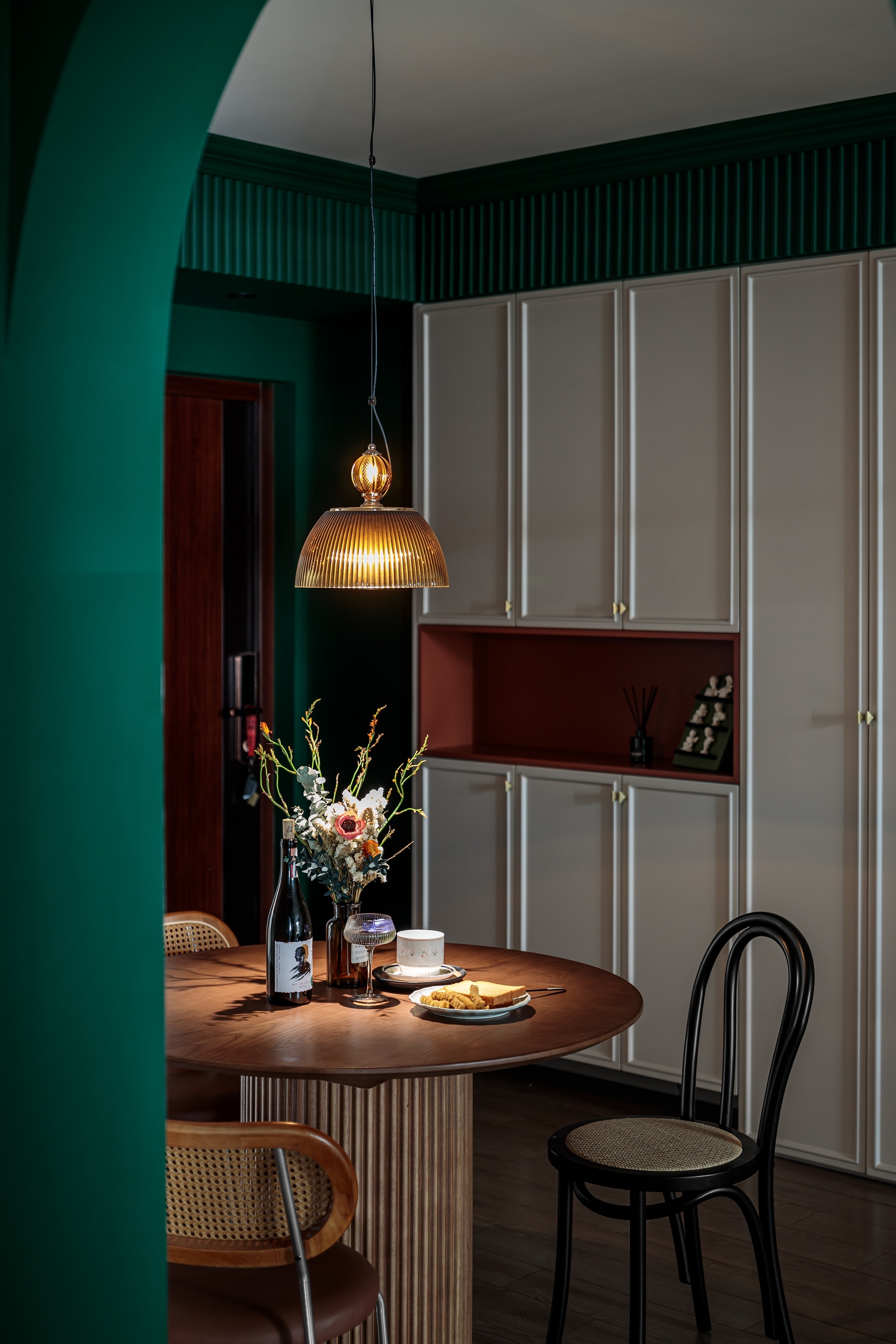 餐廳部分的光線會稍顯有點暗淡,廚房的玻璃門可以幫助餐廳引入部分光線,不用工作時,一日三餐都在此處。使用圓桌,更有聚攏和圍合感,朋友聚會時會更有聊天氣氛。