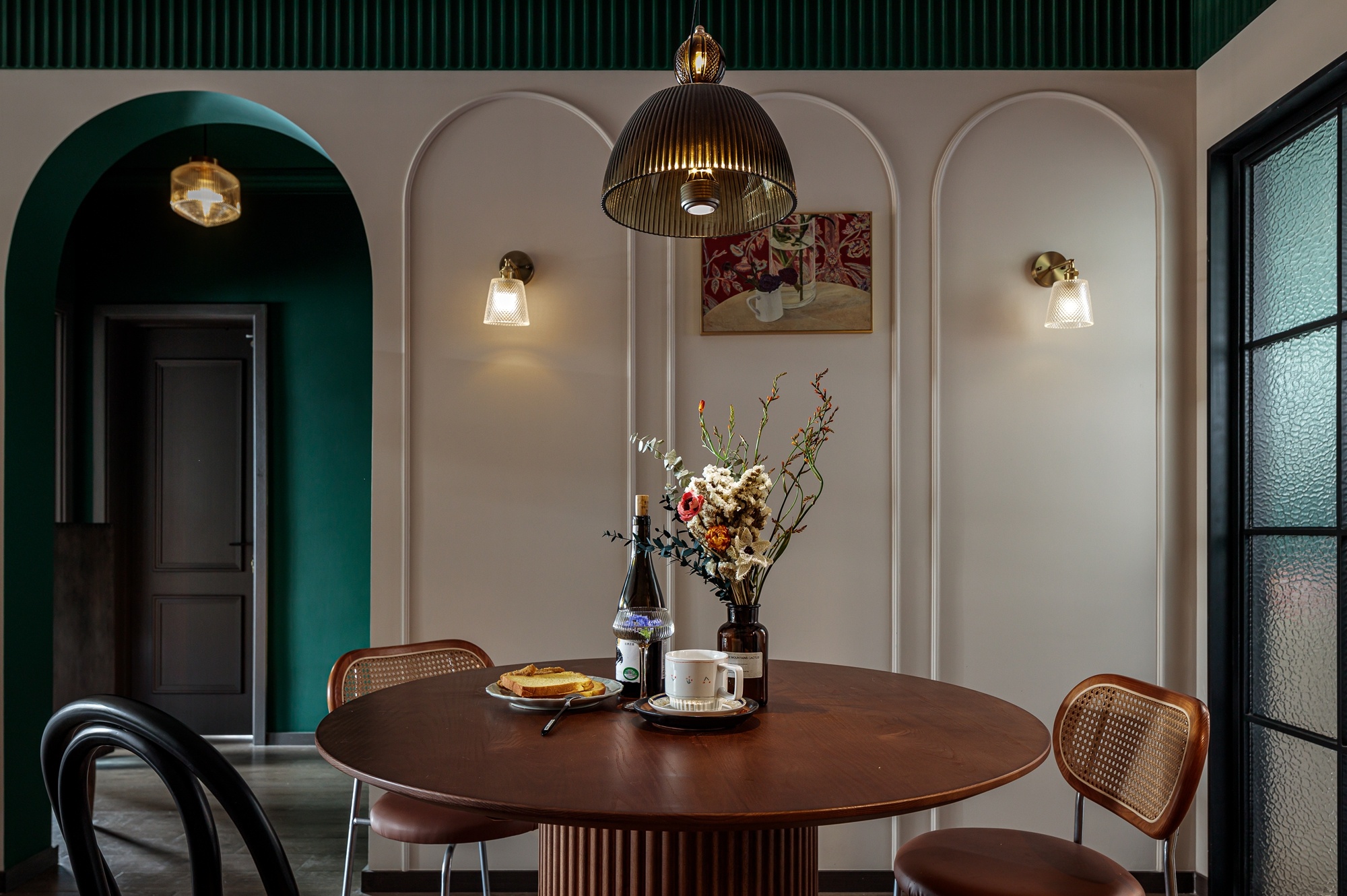 空間中的一大亮點是以拱形門進入的靜區形式,左側為衛生間干區,右側為走廊端景。暖色玻璃吊燈、壁燈為其打造氤氳的光影效果,增添空間私密感。而視覺聚焦后,內與外形成色彩對比,將動靜進行區分,在設計與呈現上更注重了隱私性與靈活性。