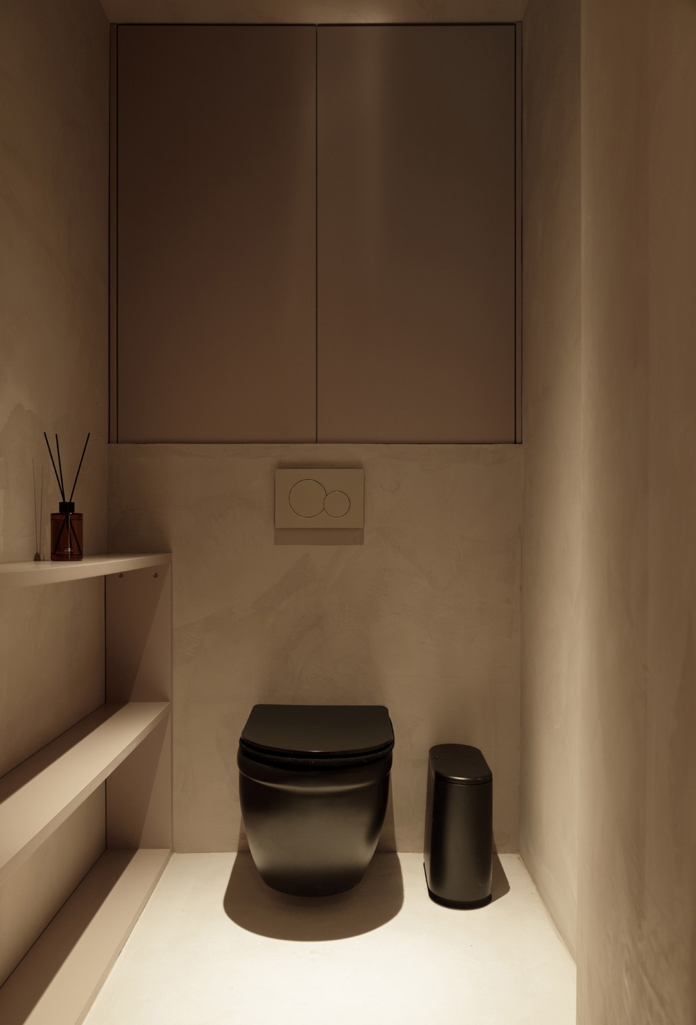 配色也和房子整體的配色呼應(yīng),暖色調(diào)的藝術(shù)漆墻面,黑色的馬桶和垃圾桶點(diǎn)綴顯得特別又高級(jí)