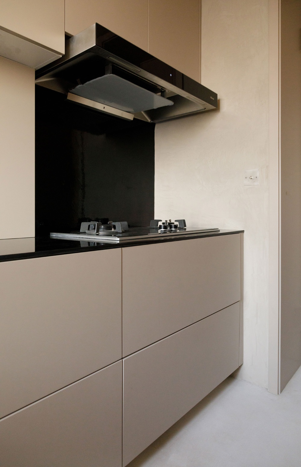墻頂面用藝術(shù)漆延申進(jìn)來,定制墻面同色的柜門板,搭配黑色的臺(tái)面和五金,金屬色的插座點(diǎn)綴