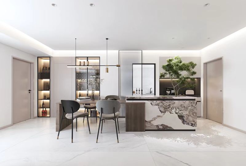 餐廳設(shè)置島臺(tái)+餐桌,島臺(tái)區(qū)域正對(duì)著入戶方向做一個(gè)造景,餐邊柜做玻璃柜門增加燈光效果讓整面墻有一個(gè)層次感。