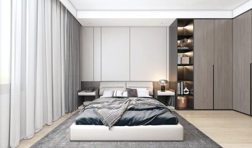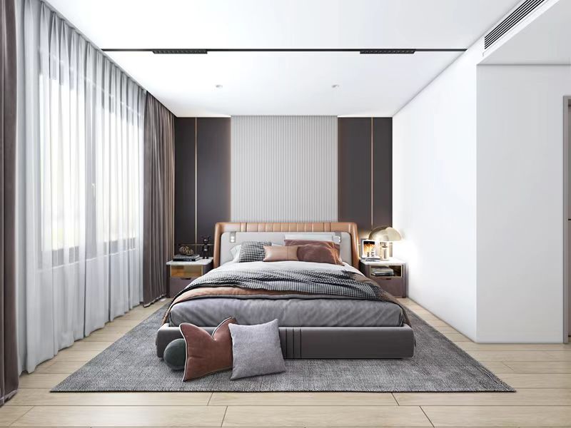 主臥呼應(yīng)客廳,使用皮質(zhì)床體配深色墻板。
