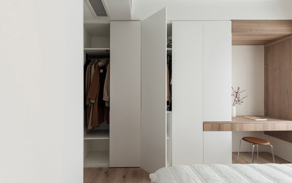 通過走廊來到了主臥,進(jìn)入主臥設(shè)計了一個步入式衣帽間,簡約的白色柜體儲物空間非常強(qiáng)大,衣柜以掛衣為主,抽屜用來收納可折疊衣物,分區(qū)域收納,便于生活使用,走到盡頭左手邊是主衛(wèi),右手是寢區(qū),整個寢區(qū)域進(jìn)行抬高,滿足不同功能區(qū)域使用的場景感受,梳妝臺與飄窗臺合為一體,將木飾面進(jìn)行包裹,燈光從床頭延伸到了窗臺。