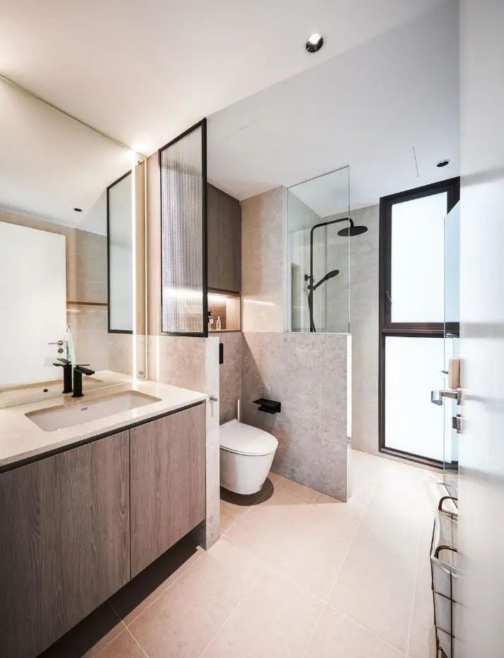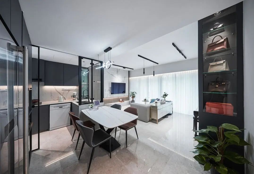 進門一條長走廊,業主給利用起來裝上一排頂天立地式的柜子,收納量猶如一間衣帽間一般,并且黑色的柜體,給人穩重的視覺效果,在進門的那一刻就給人留下了深刻的印象。
