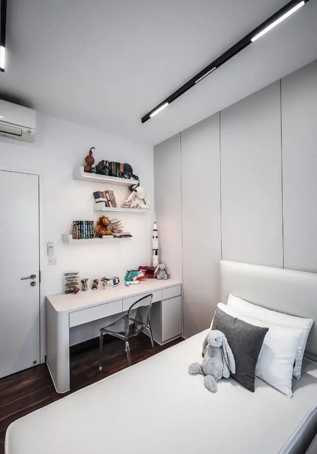 沙發不靠墻,后方的空間騰出來打上柜子留出鋼琴的擺放位置,將這里打造成多功能房使用,給居者預留出一個陶冶情操的空間。