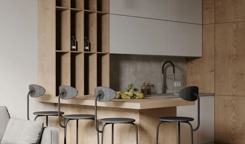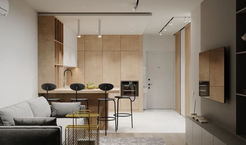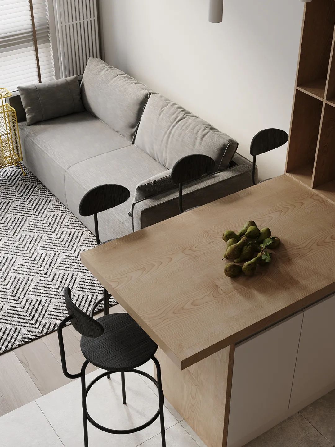 狹長的玄關正對開放式廚房,考慮到兩側都是屋門,且入戶門緊貼兩側墻體打不了柜子,因此將玄關柜納入公共儲物空間,以保證正常的行走。