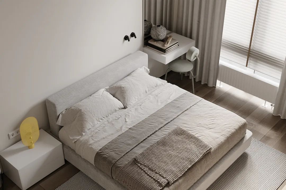 睡眠空間選用低飽和度的色彩平靜而優雅,一側床頭柜用于放置手機等雜物,靠窗一側是迷你梳妝臺,懸空設計清爽利落,偶爾還能用來臨時辦公。