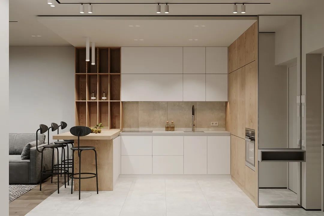 原木色+白色櫥柜干凈百搭,釋放出舒緩的氣息,無把手的設計減少磕碰,U型布局動線合理高效,嵌入式家電極致利用空間,小廚房也能“五臟俱全”。