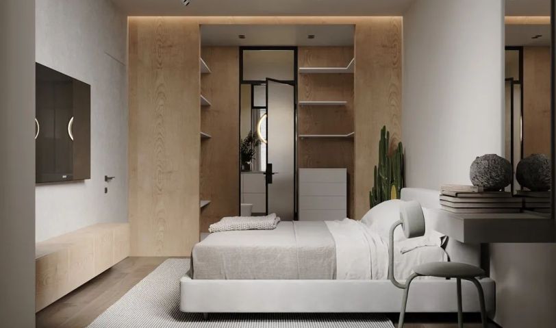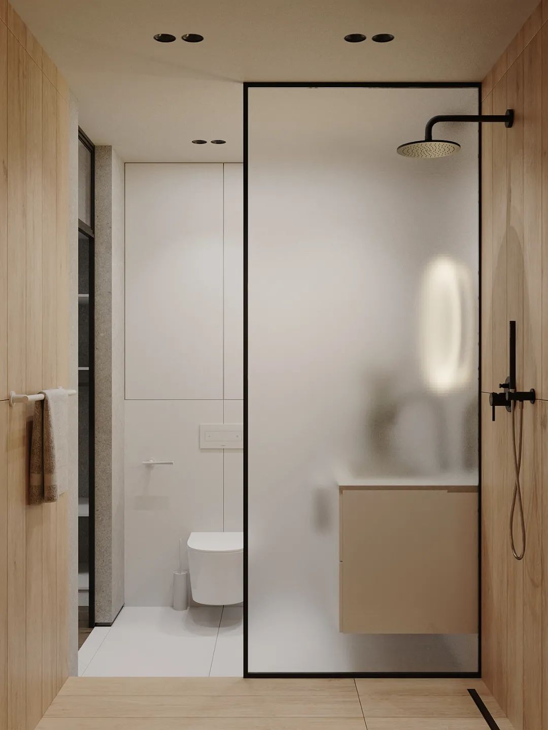 連接睡眠區與主衛的過道兩側,設計師用兩組平行柜體組成開放式衣帽間,足以容納當季常穿服裝。衛生間采用黑框長虹玻璃門,簡美大方,保證隱私的同時也讓兩側陽光無礙進入室內。