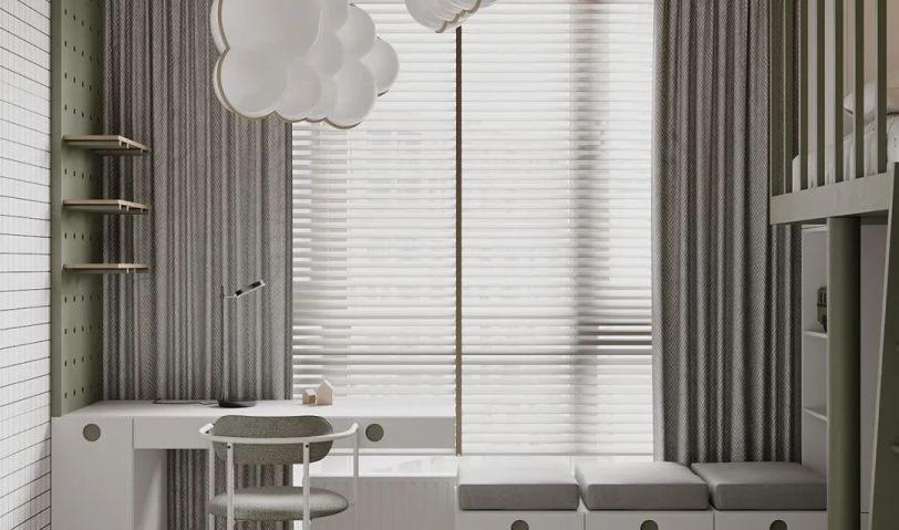 兒童房目前兼用作書房,綠+白組合讓視覺頓時清爽起來,洞洞板搭配小書桌,在云朵燈的照射下,透著浪漫和輕松。