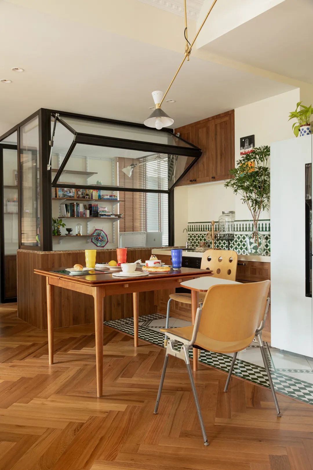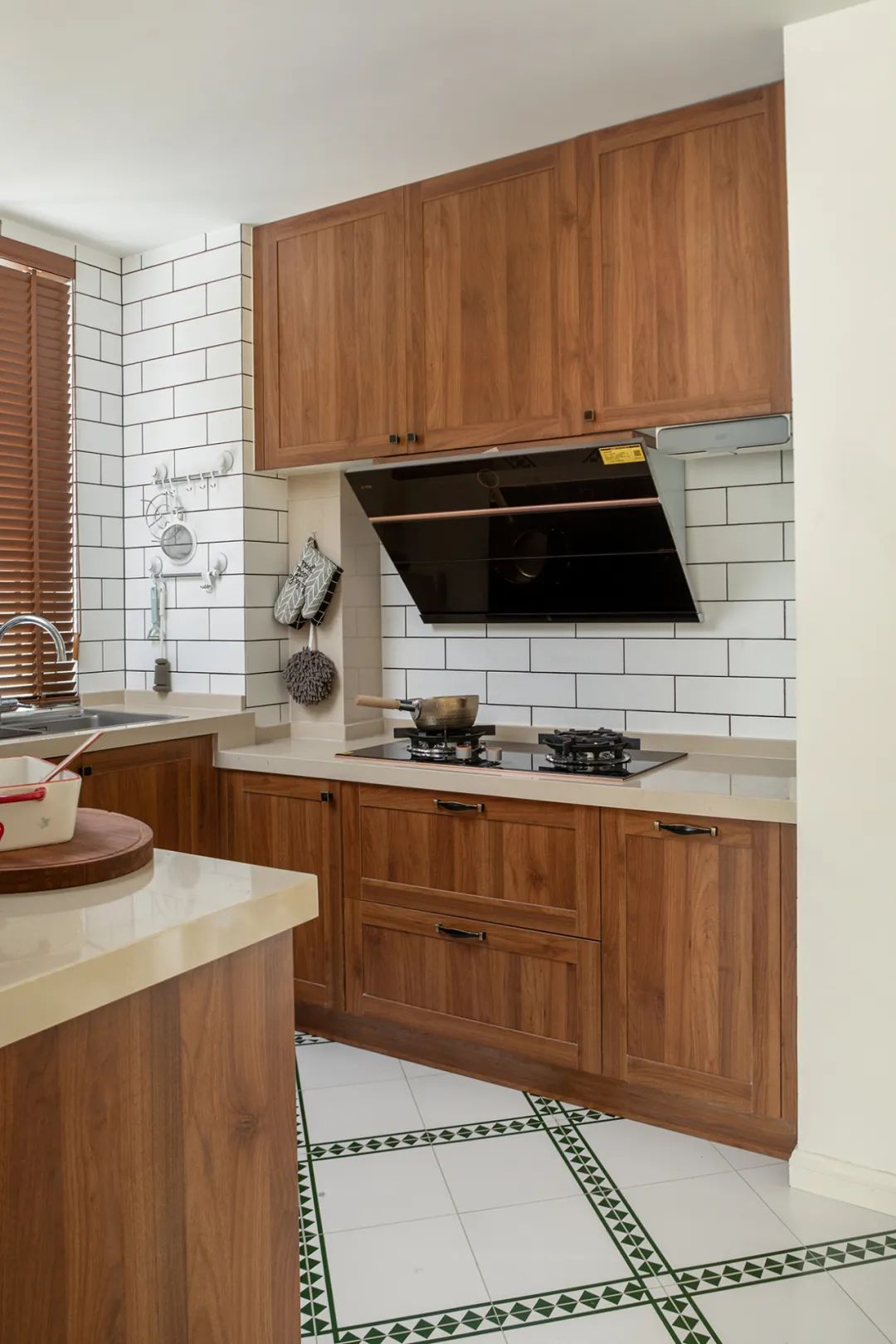 西廚地面和墻面的復古小磚,靈感來自于巴塞羅那老式建筑,復古綠+幾何花紋,對稱清新,小的細節總會給人驚喜。