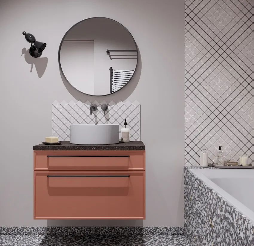 衛生間沿用水磨石元素,干區的懸空洗手臺,背面局部鋪磚+防水漆,美觀好打理。