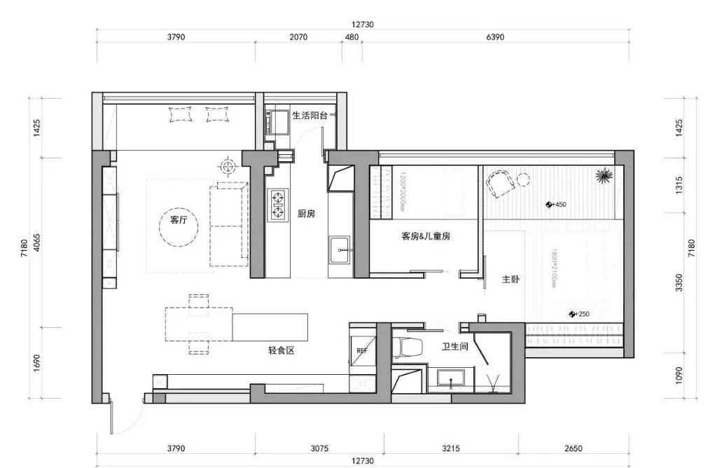 2. 舍棄原本的次衛,將其納入餐廳空間,設置島臺,形成餐廳+輕食區的形式。