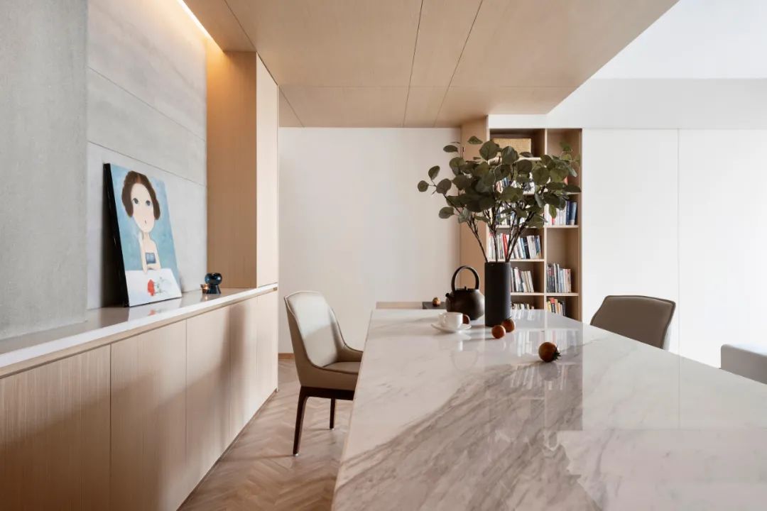 女主人是甜品店店長,性格開朗卻很喜歡宅家、熱愛看書,夫妻倆工作都比較忙,希望家里極簡又溫馨,盡量避免冗余,保持空間通透、清新。
