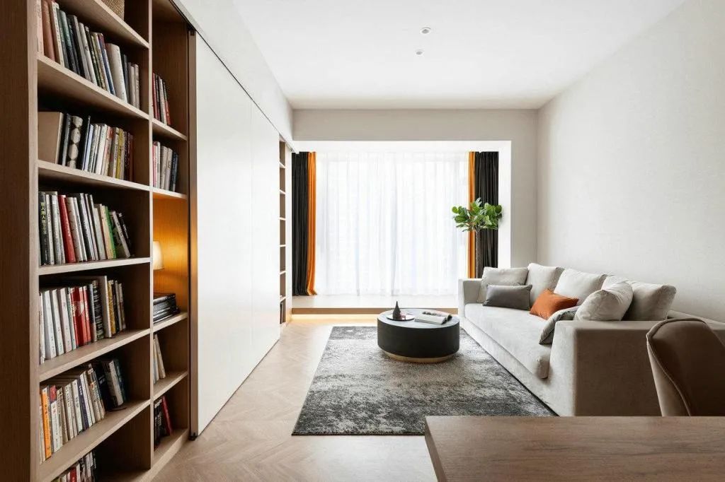 客廳用可開合書柜取代傳統背景墻,收納屋主的各種藏書,保留電視+靈活的吊軌移門設計,朋友和老人過來玩也能滿足觀影需求。