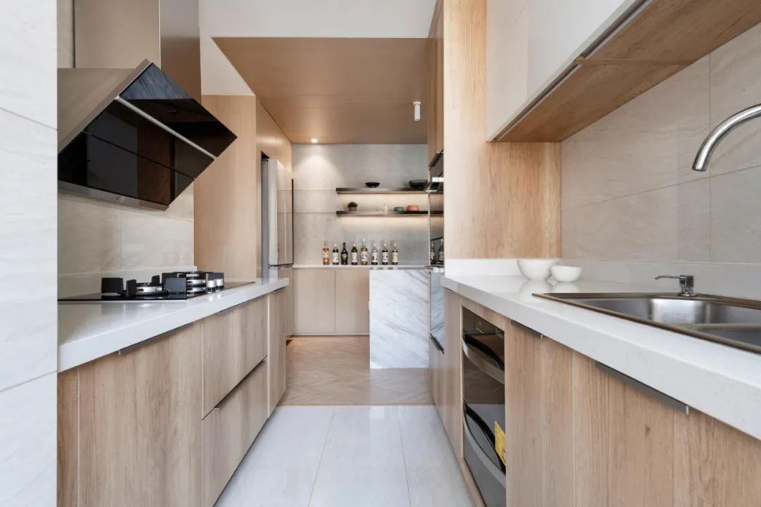 餐廳到廚房的天花交匯處,銜接了三個空間的層高、梁脊,保證所有水電、設備管道的合理布局,才最終實現極簡的大平頂。