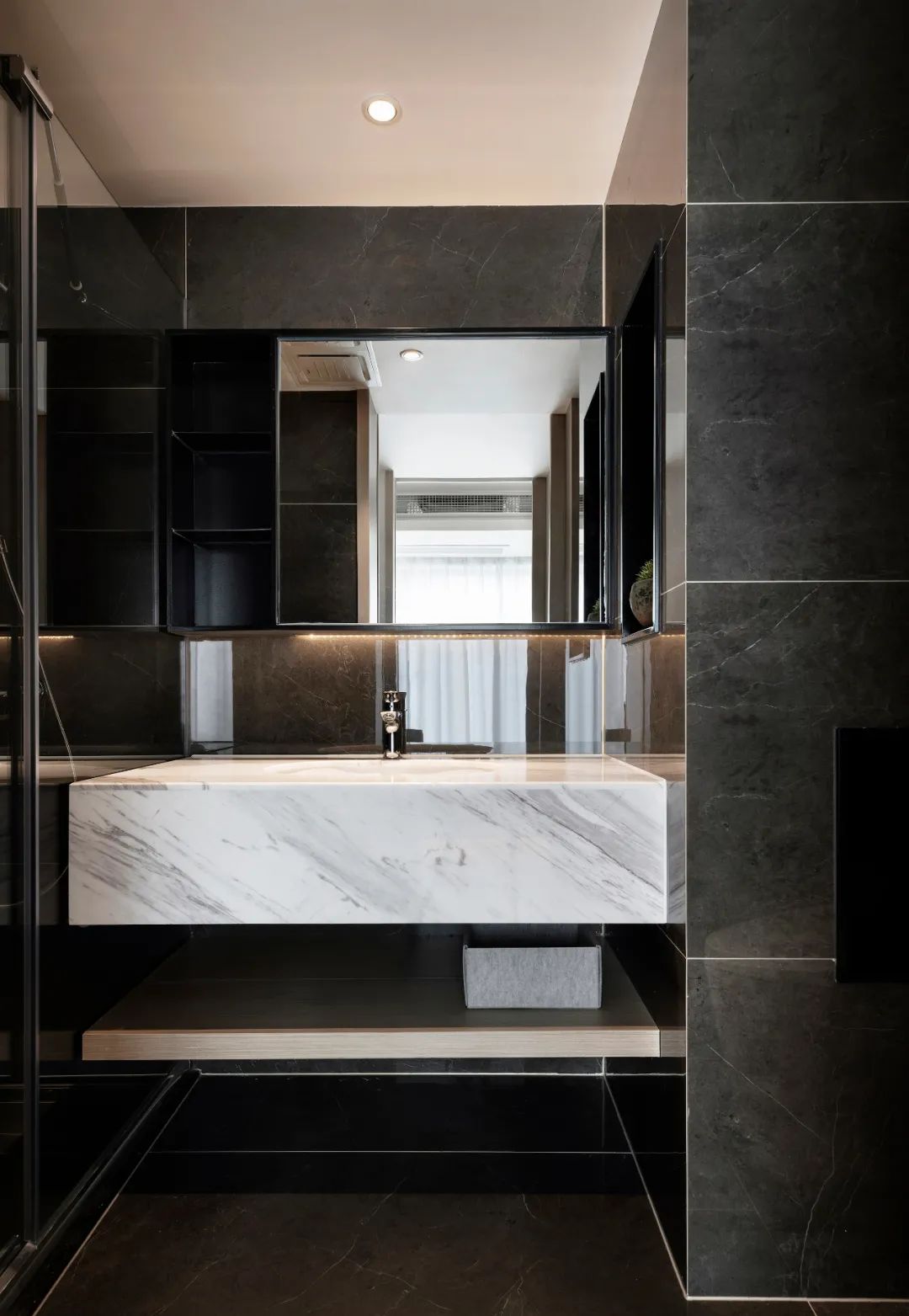 干區洗手臺選擇墻排,底部沒有水管,更精簡也方便清潔。