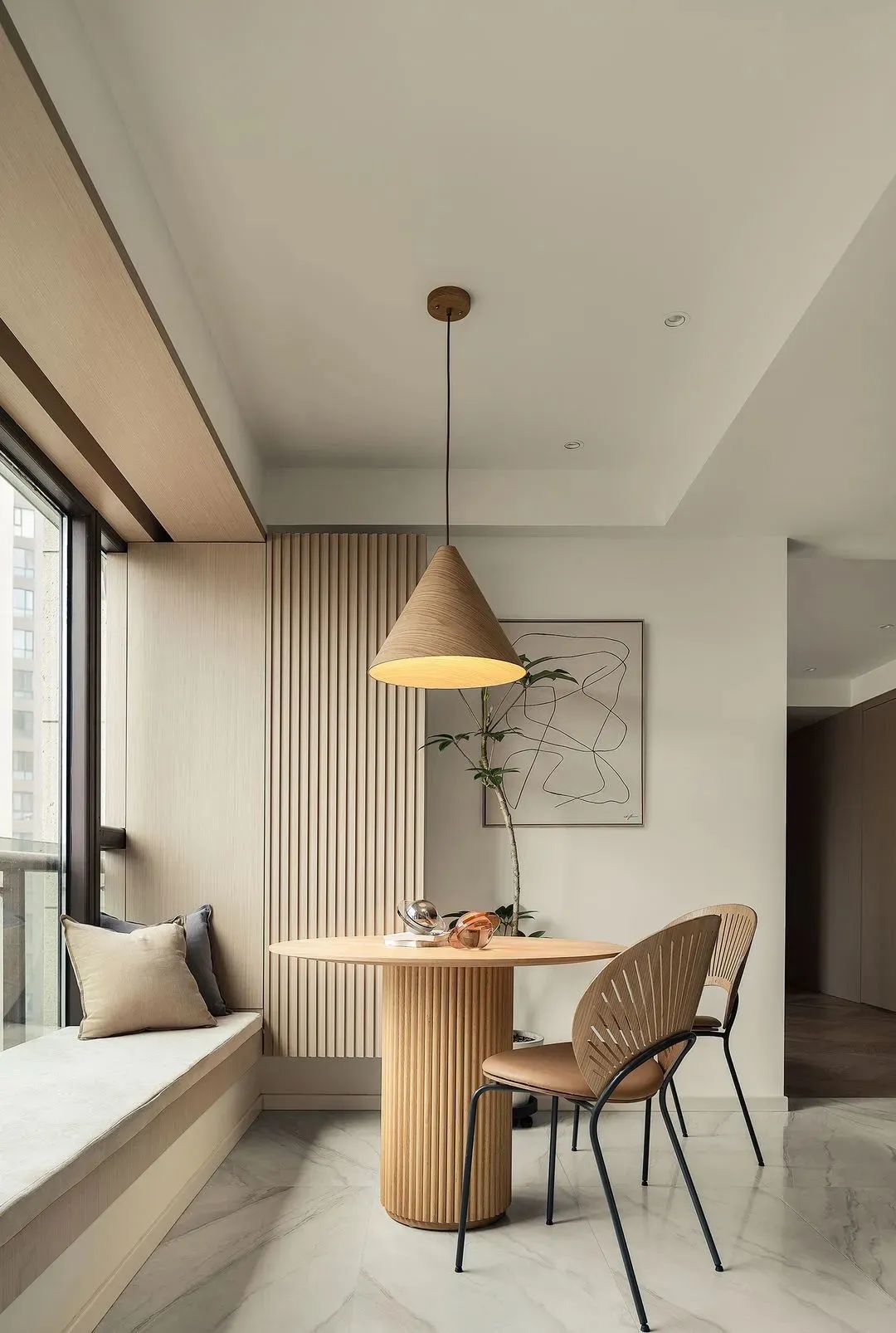 由入戶花園改造后的餐廳,結合卡座容納5個人吃飯都沒問題,格柵柜里面隱藏了丑丑的鍋爐,柜門和餐桌餐椅整體搭配很和諧。