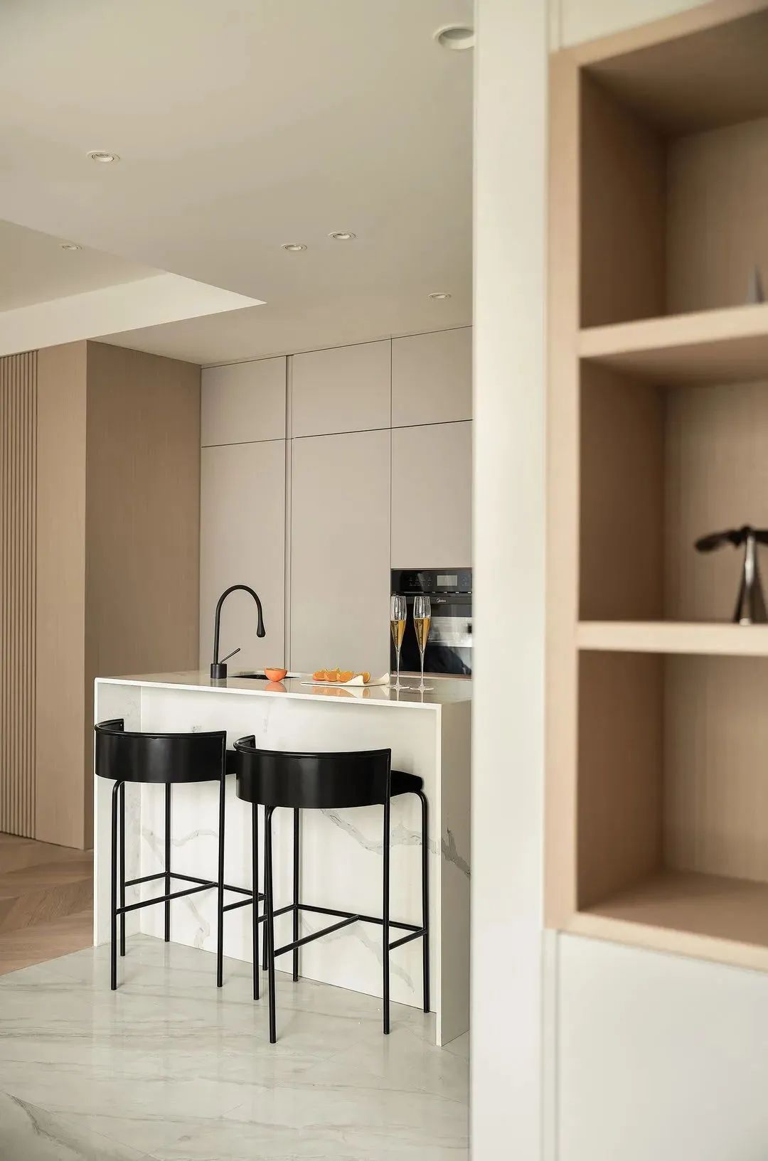 2. 中西廚結合開放式空間,冰箱暗藏,整排的酒柜契合屋主喜歡買酒的習慣。