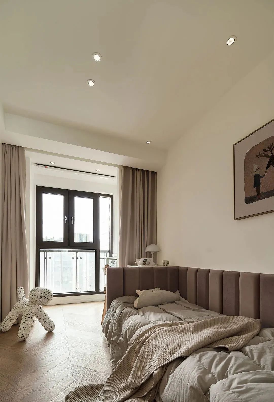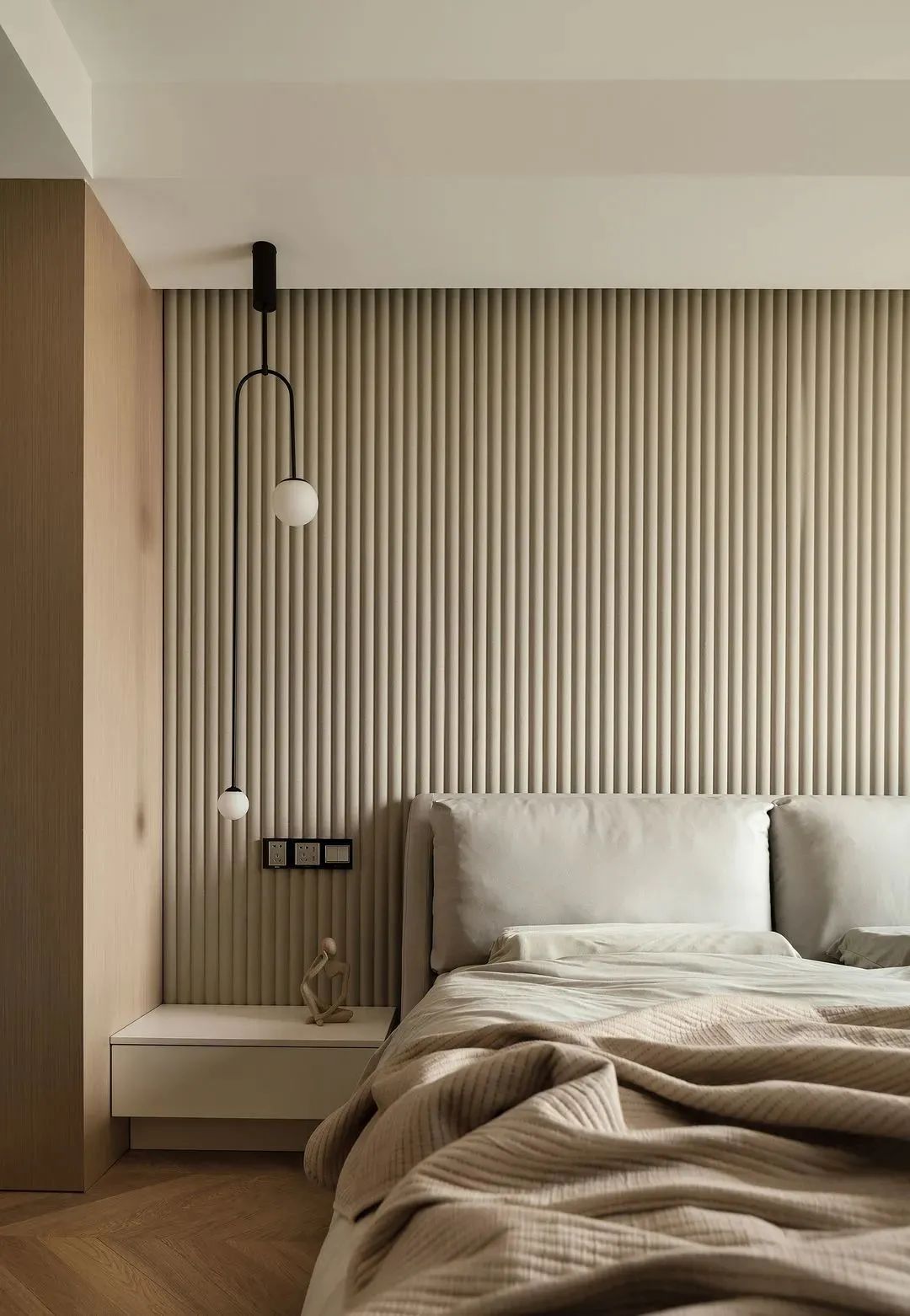 主臥背景采用的是墻布包波浪板結合木飾面的設計。