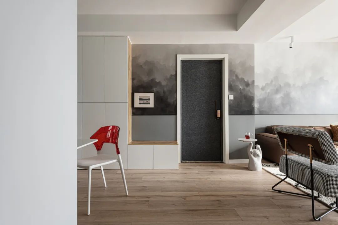 為了滿足儲物需求,進門右側設計為2920mmx350mm的鞋柜+儲物柜。將大門用毛氈進行處理,和整體色系風格融合,也省去了改色的麻煩。