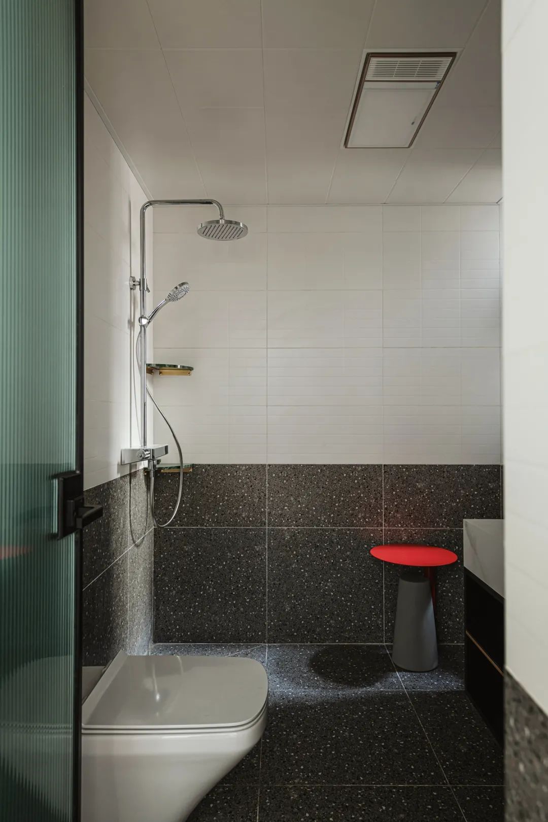 衛生間面積局促,選擇壁掛馬桶更節省空間。利用水磨石和白色瓷磚搭配拉升空間高度,最大限度擴大空間感。