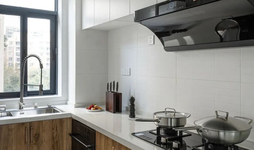 廚房空間寬裕,往里推860mm,留出獨立空間給冰箱,用移門分隔