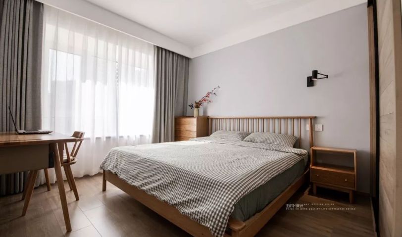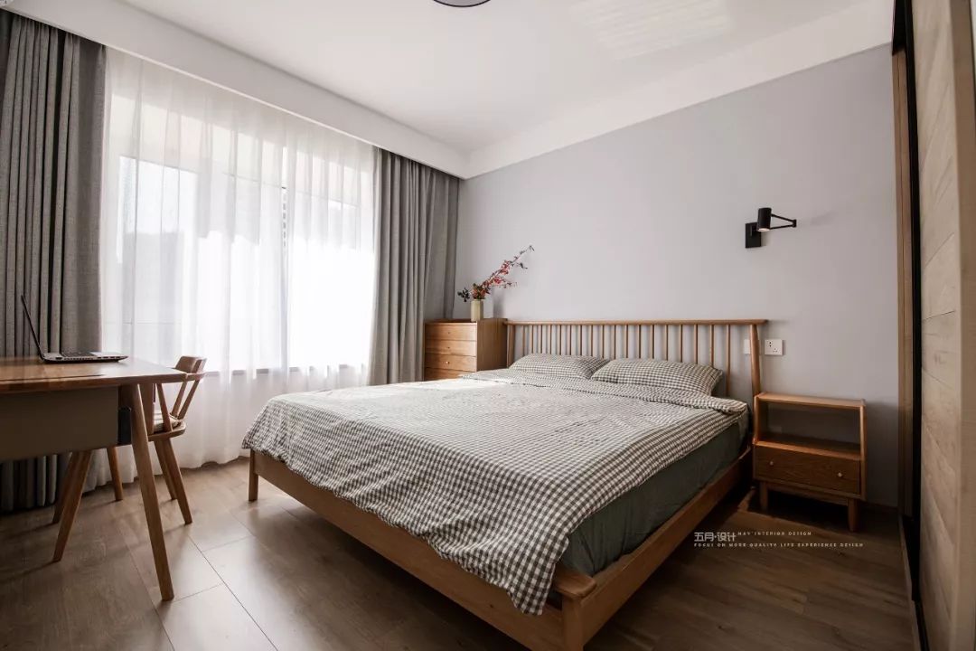 臥室是夫妻的二人世界,為了空間完整性,將衣柜做了嵌入式設計,增加了收納空間,也擴大了整體活動空間,并運用愜意的色調搭配,讓整個主臥寧靜、舒適、溫馨、時尚。