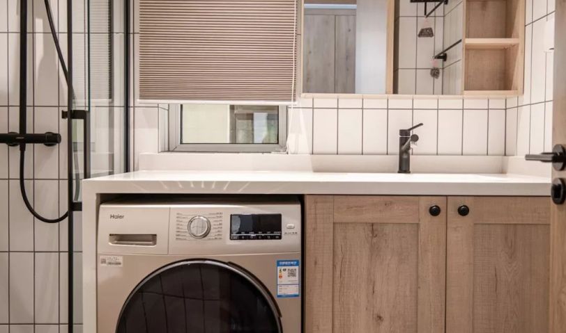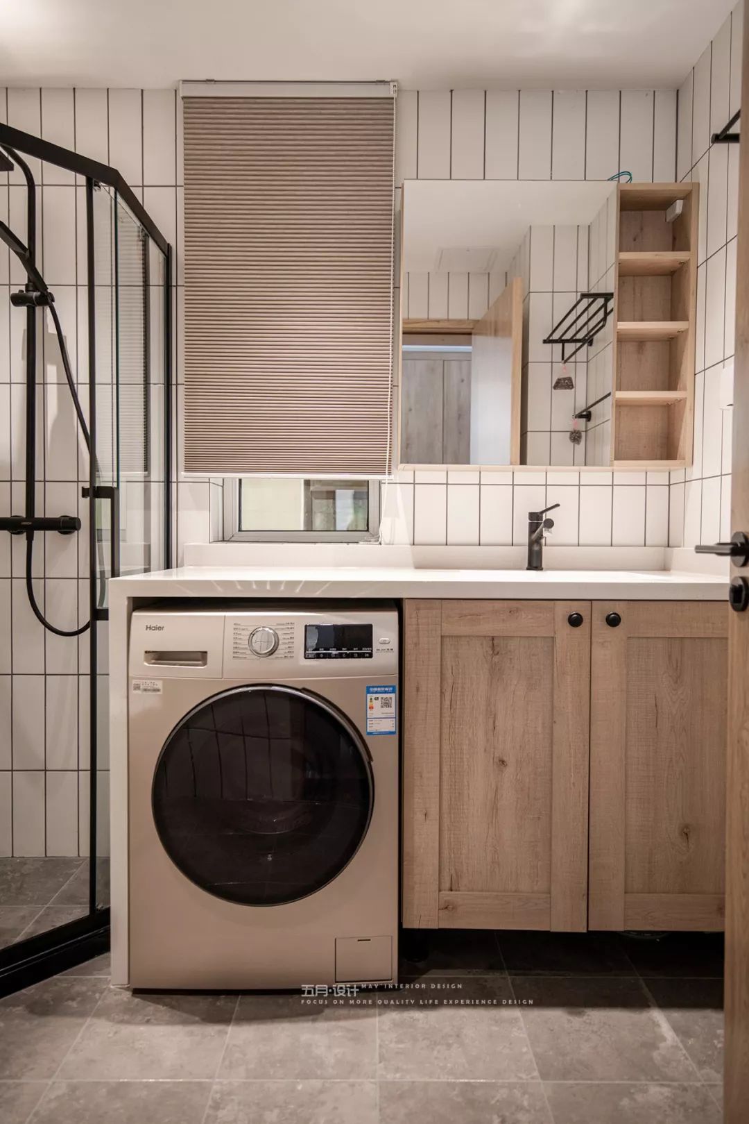 衛生間滿足各功能設計的基礎上,嵌入了洗烘干設備,整體設計簡潔利落且實用。鏡柜、五金掛件、浴室燈很多細節的設計滿足了未來生活的功能需求,讓空間整潔舒適,同時瓷磚的選擇上采用了小磚,秩序排列增加了空間的趣味性。
