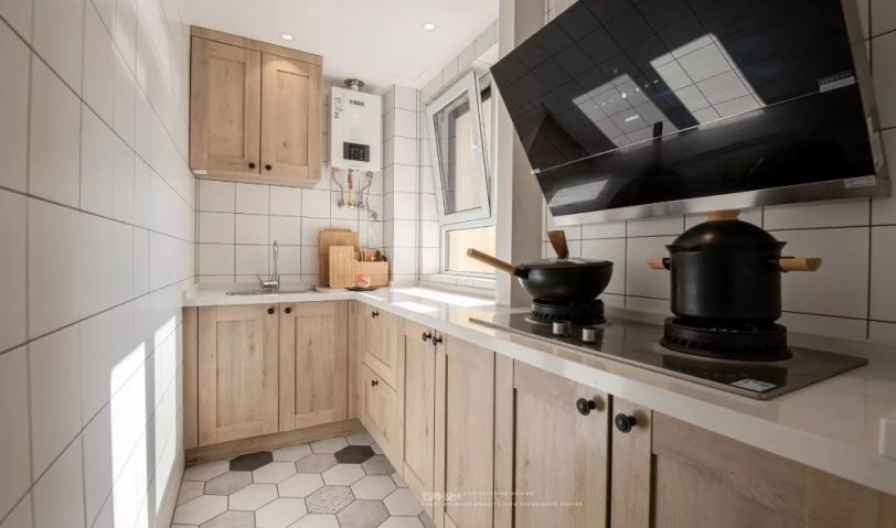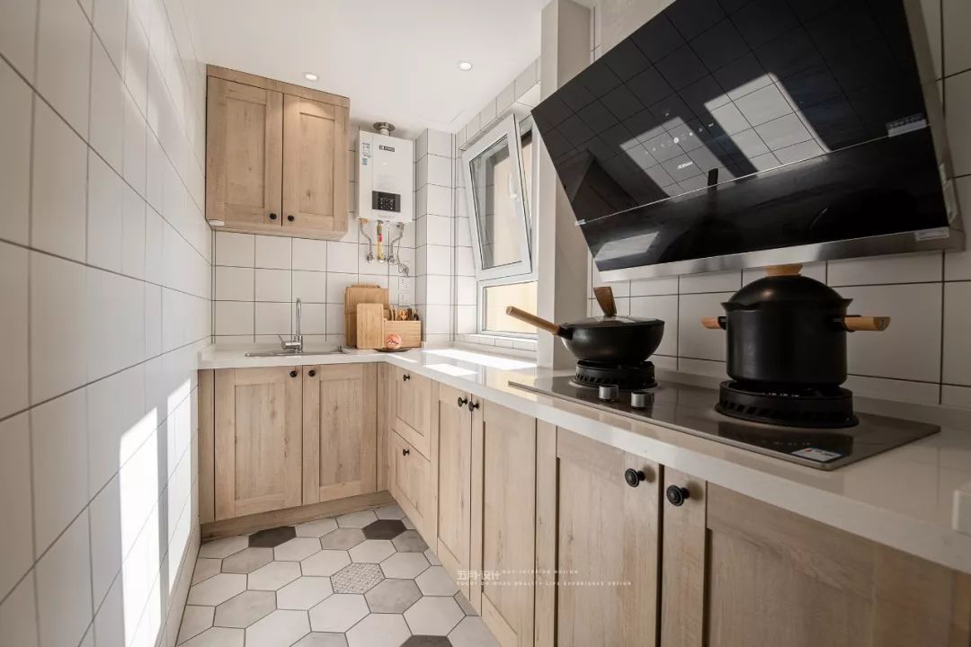 L型的廚房空間,墻面的白磚搭配原木色定制櫥柜,簡潔自然,六邊形地磚的使用,增加了時尚感下趣味性。